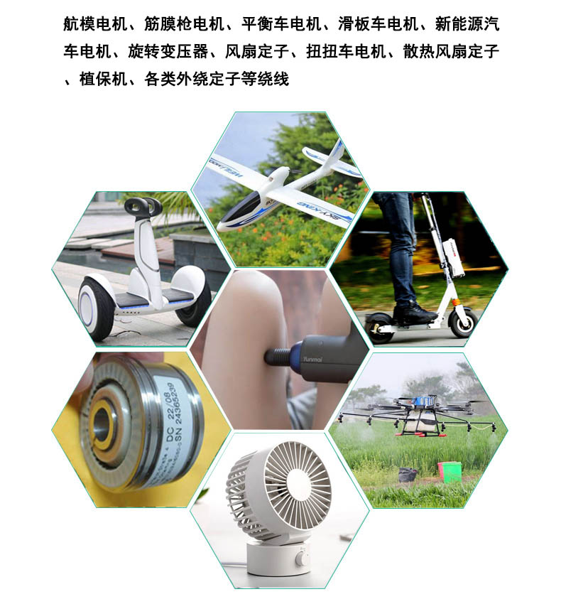航模電機、筋膜槍電機、平衡車電機、滑板車電機、新能源汽車電機、旋轉變壓器、風扇定子、扭扭車電機、散熱風扇定子、植保機等各類外繞定子等繞線