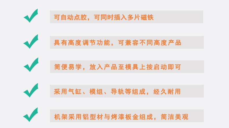◆ 點膠和插磁一體,先點膠,再插磁 ◆ 可同時插入多片磁鐵,帶磁不帶磁可通用 ◆ 簡便易學,只需放入產(chǎn)品至模具上再按下啟動按鈕即可 ◆ 運動部分采用無桿氣缸、導軌、直線軸承等,經(jīng)久耐用 ◆ 機架采用鋁型材與烤漆鈑金組成,簡潔美觀