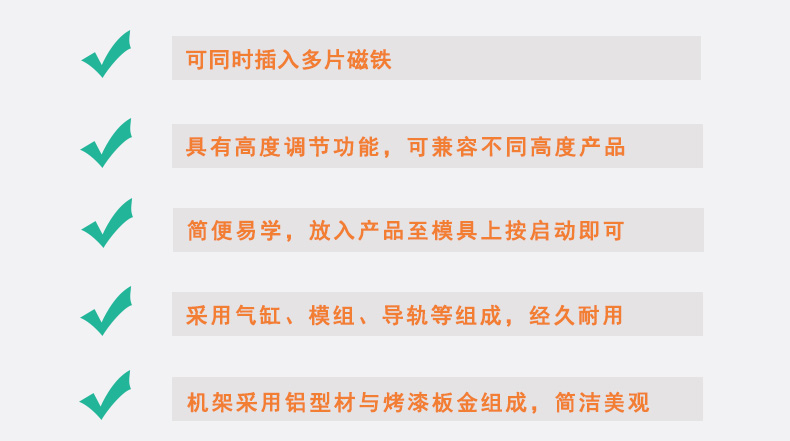 ◆ 可同時插入多片磁鐵,一槽可插多次 ◆ 簡便易學,只需放入產品至模具上再按下啟動按鈕即可 ◆ 運動部分采用無桿氣缸、導軌、直線軸承等,經久耐用 ◆ 機架采用鋁型材與烤漆鈑金組成,簡潔美觀